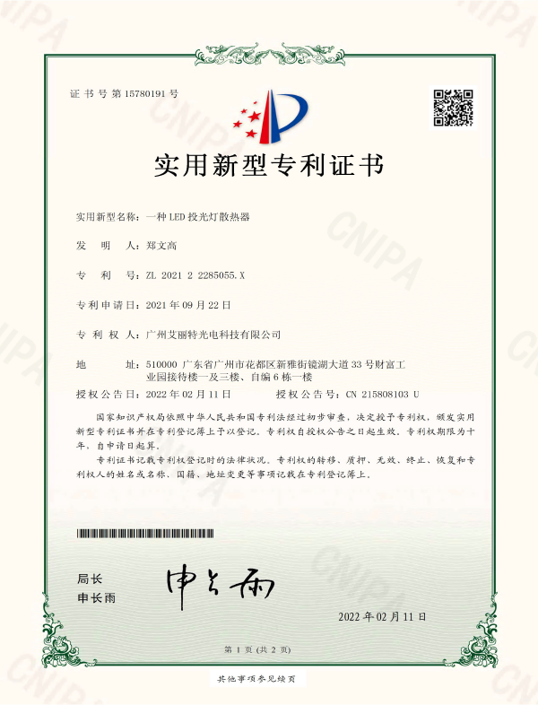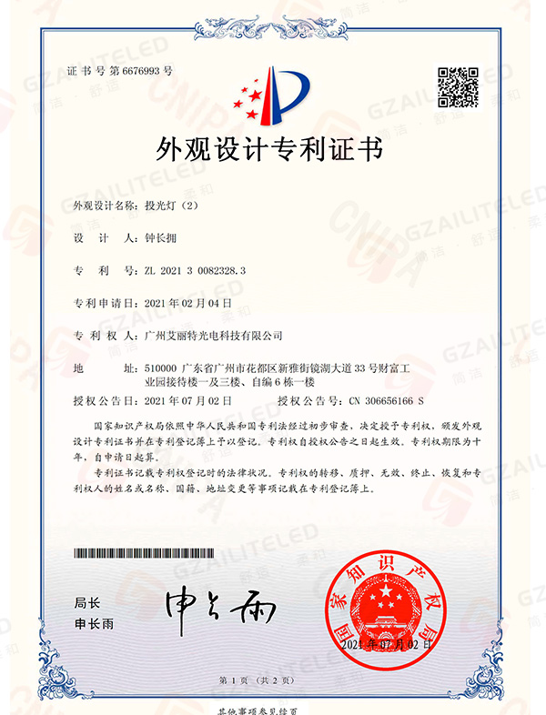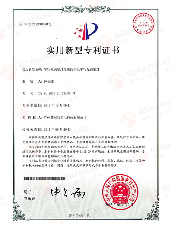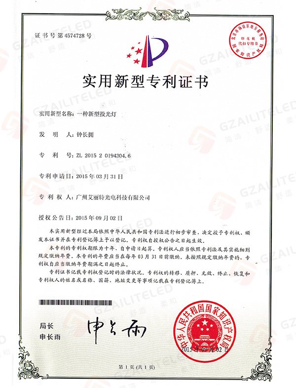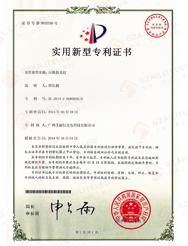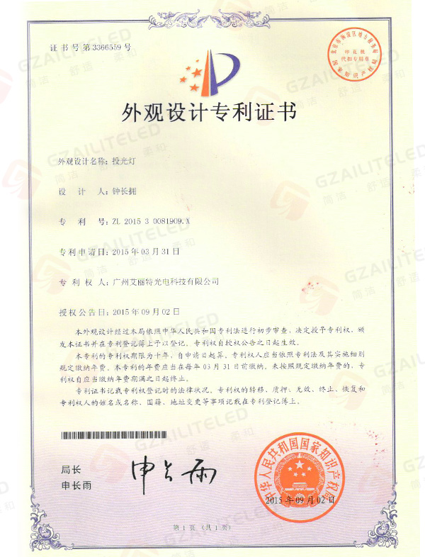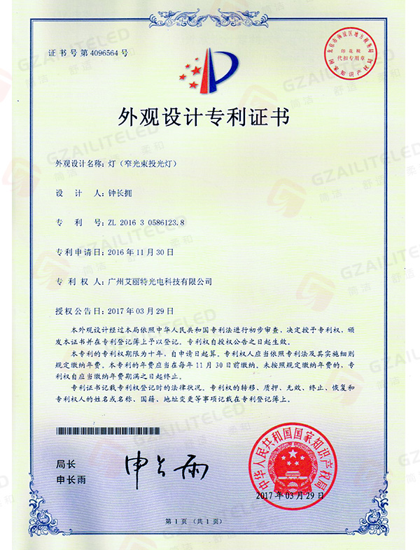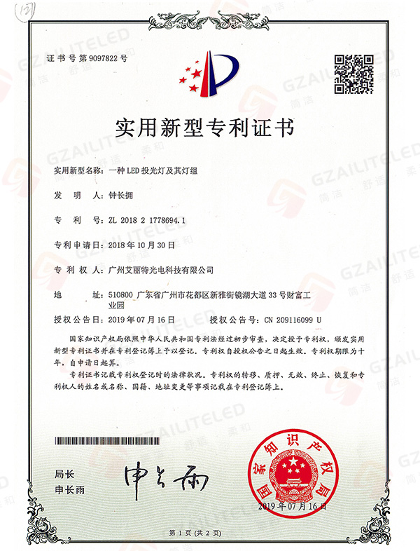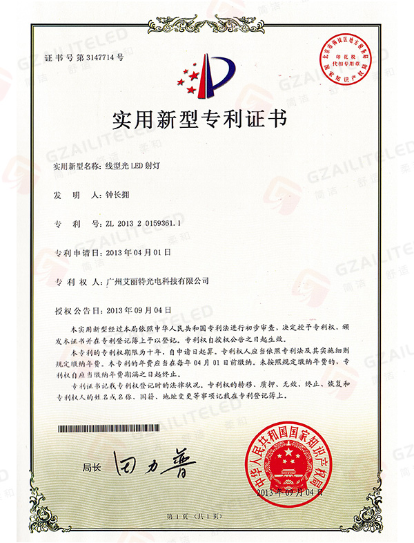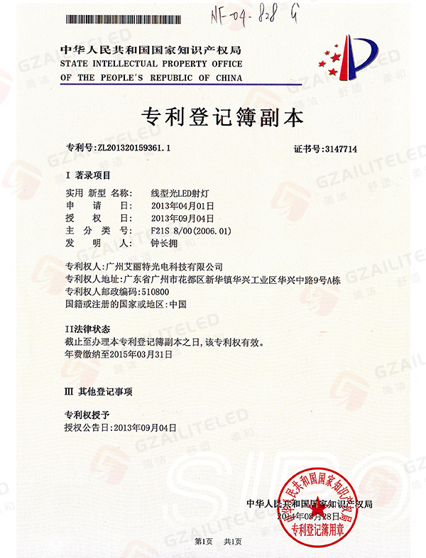 线型光LED射灯专利登记簿